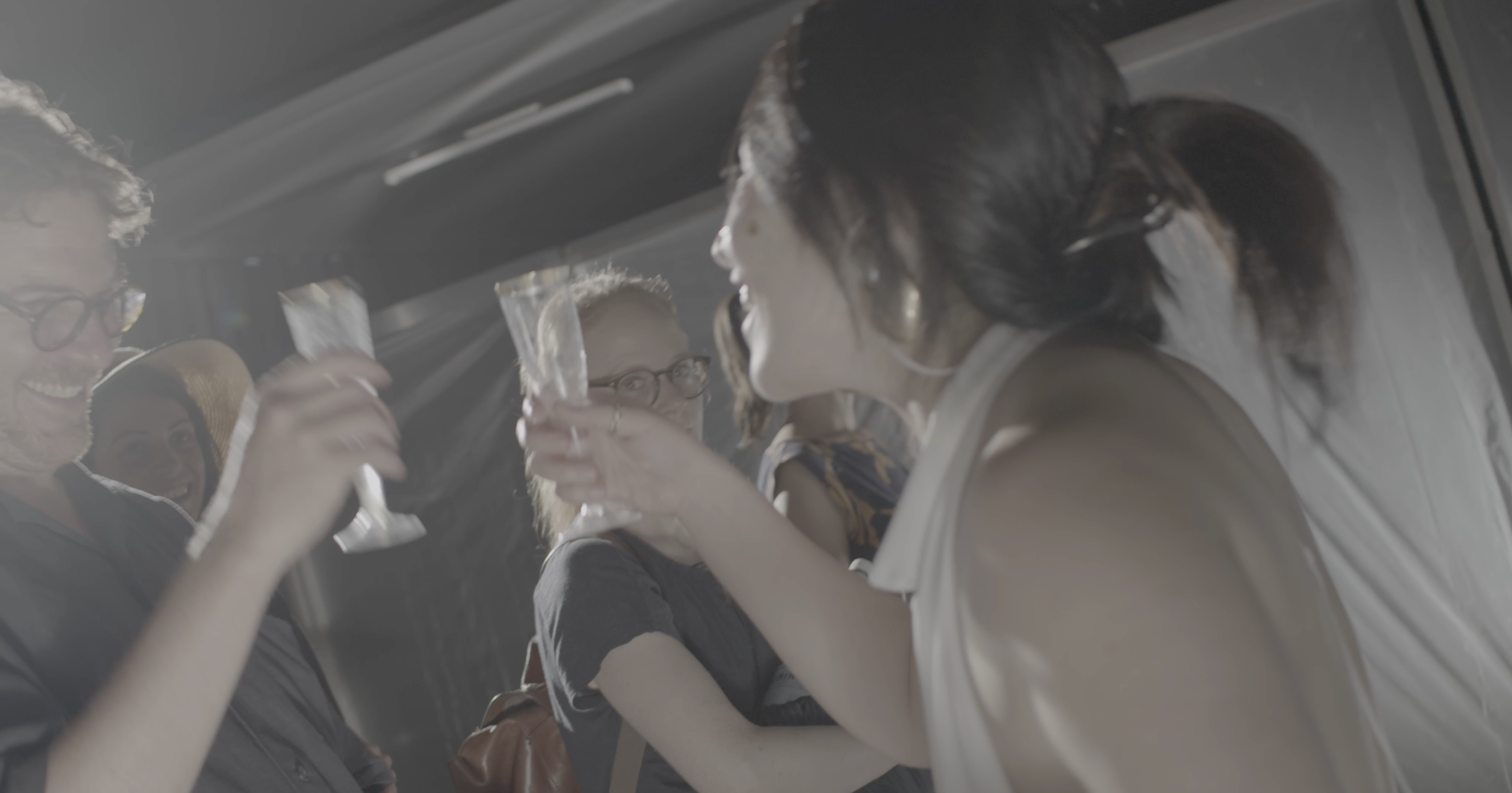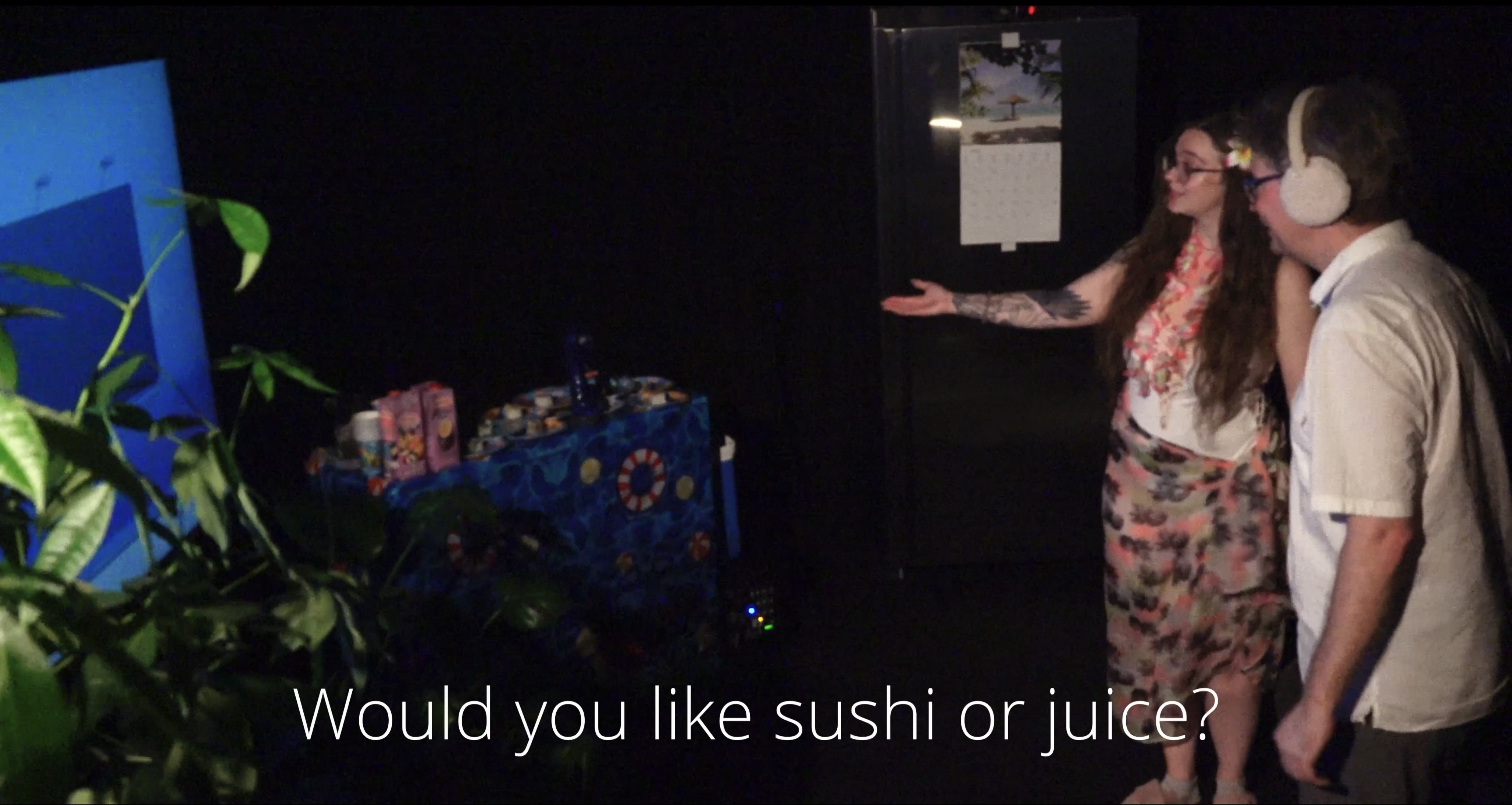 After, the musicians in the second room signal the audience members to move to the third room. There, they are allowed to sit down and relax, enjoying a cool breeze and ambient 'beach' sound design. They are offered sushi and juice. There is a video of the ocean to watch, over which flashes images of musicians playing.